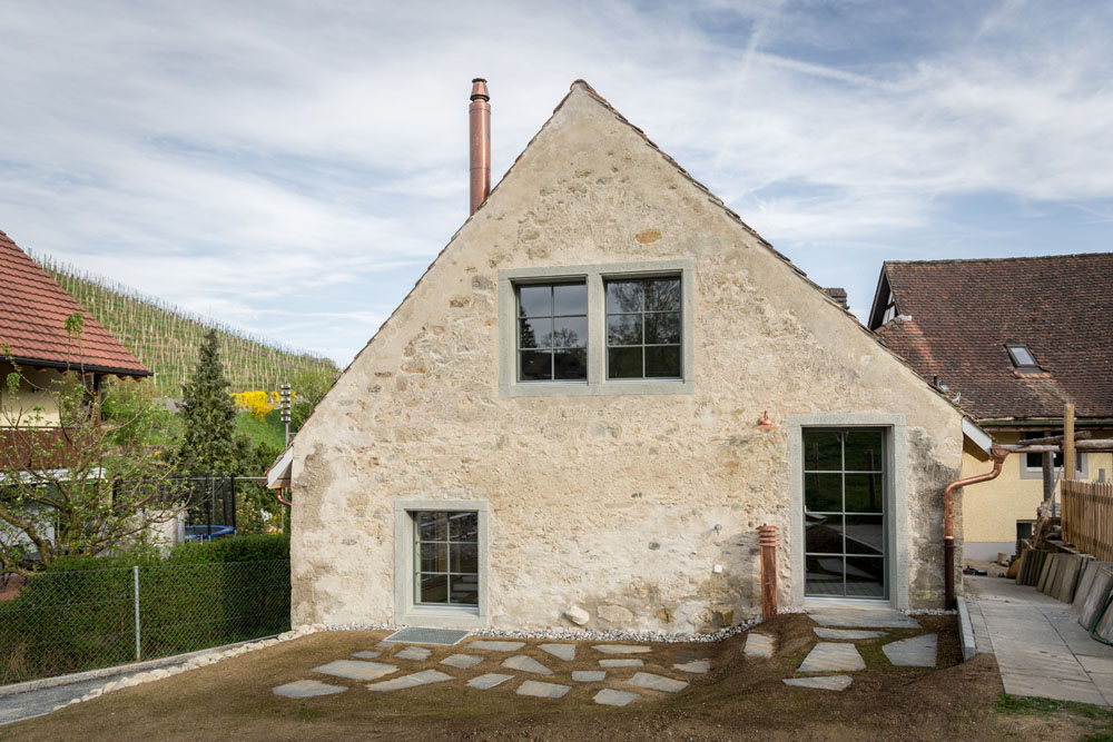 Die Herausforderung bestand darin, das gewünschte Raumprogramm auf der kleinen Grundfläche (inkl. Aussenwände knapp 100 m²) unterzubringen und dabei eine helle, behagliche Wohnatmosphäre zu schaffen – trotz der unmittelbaren Lage an einem öffentlichen Wanderweg.