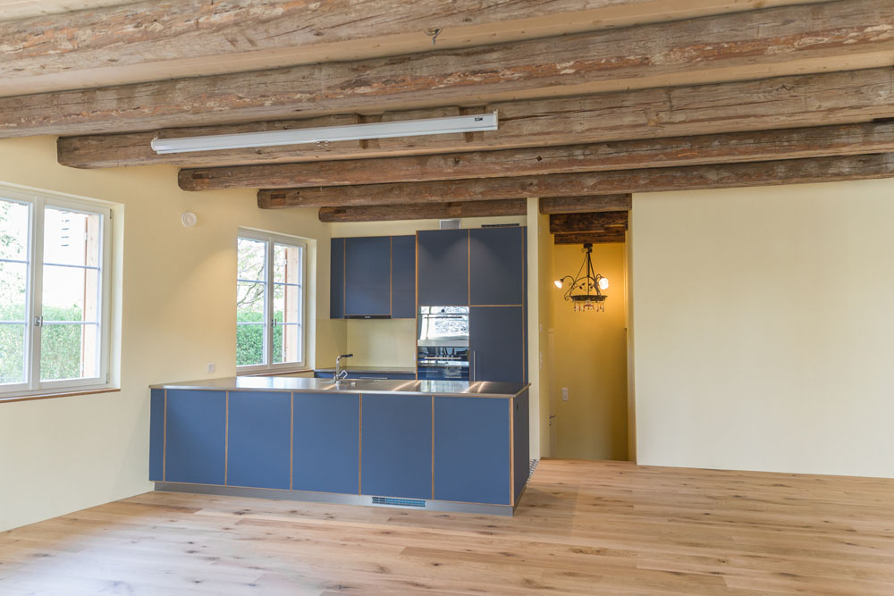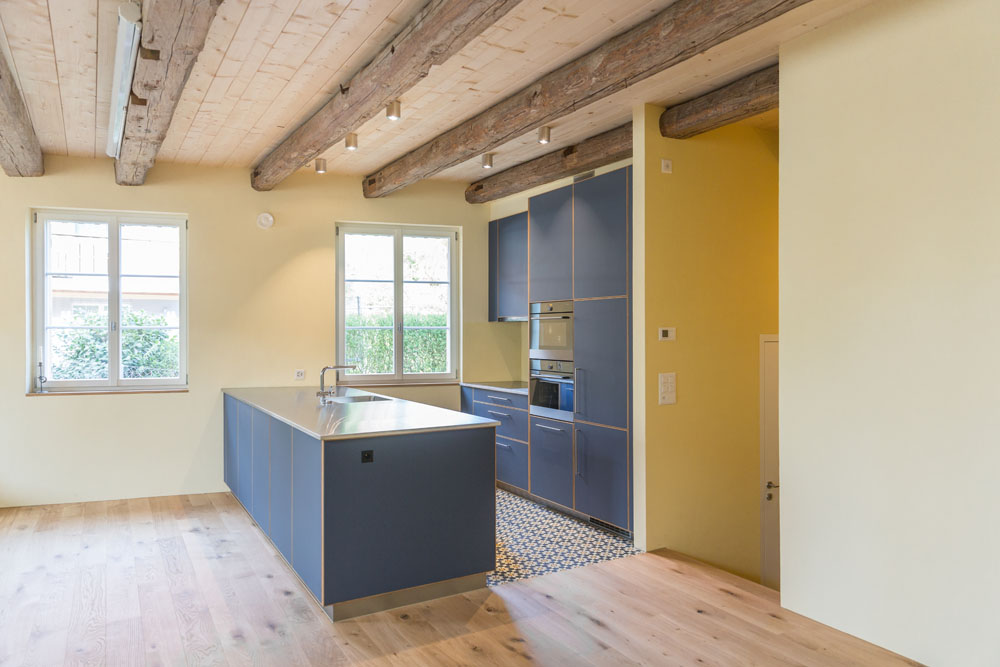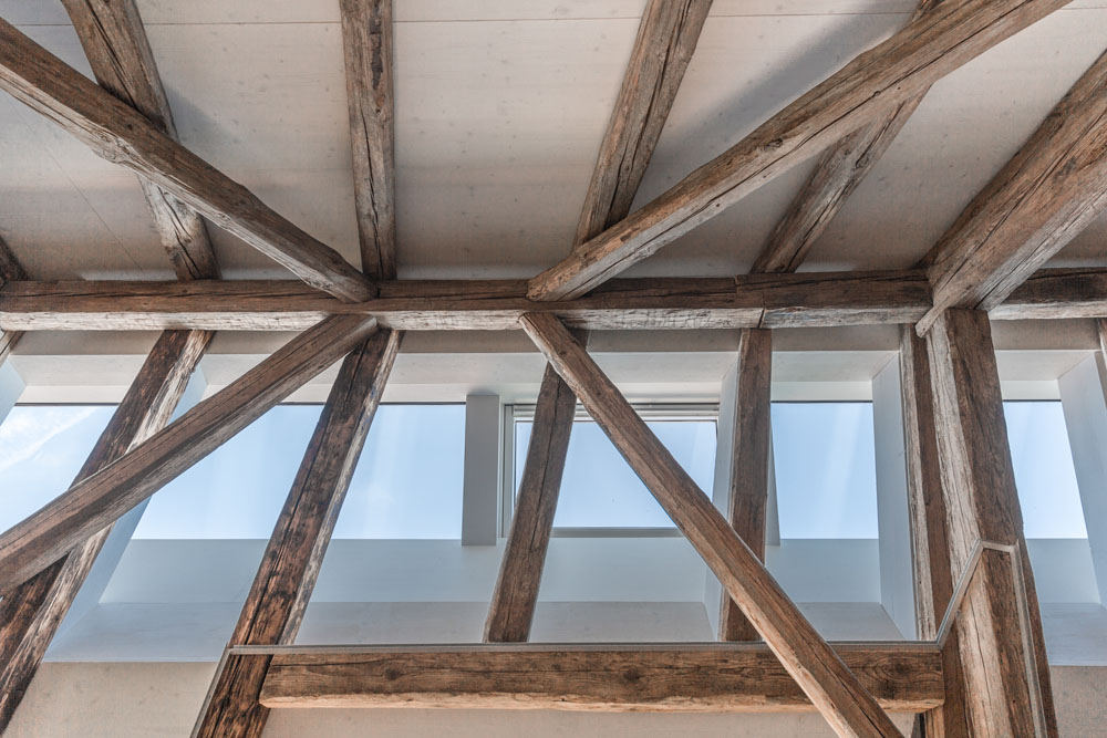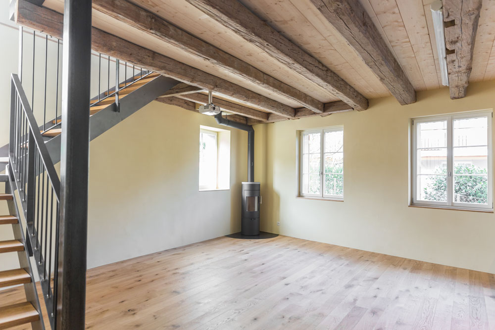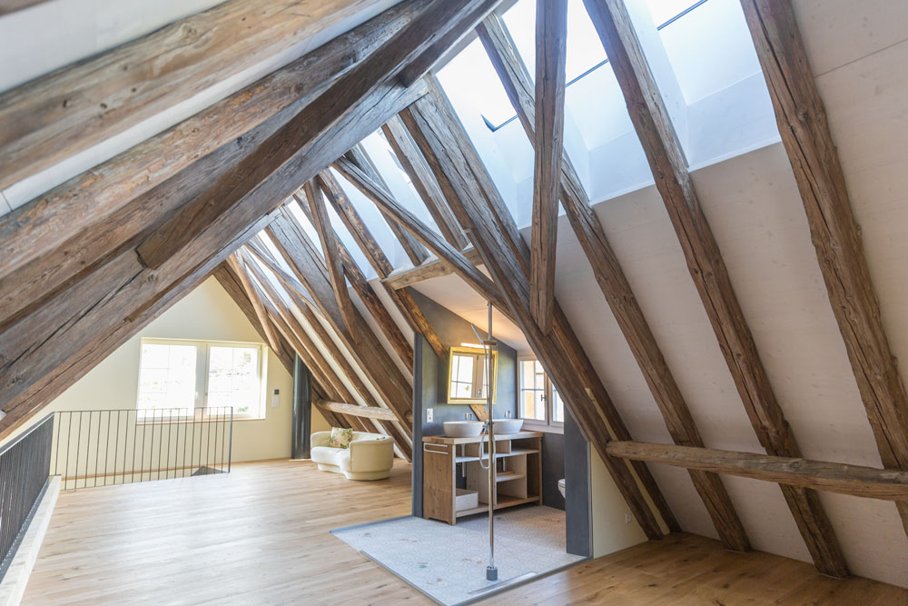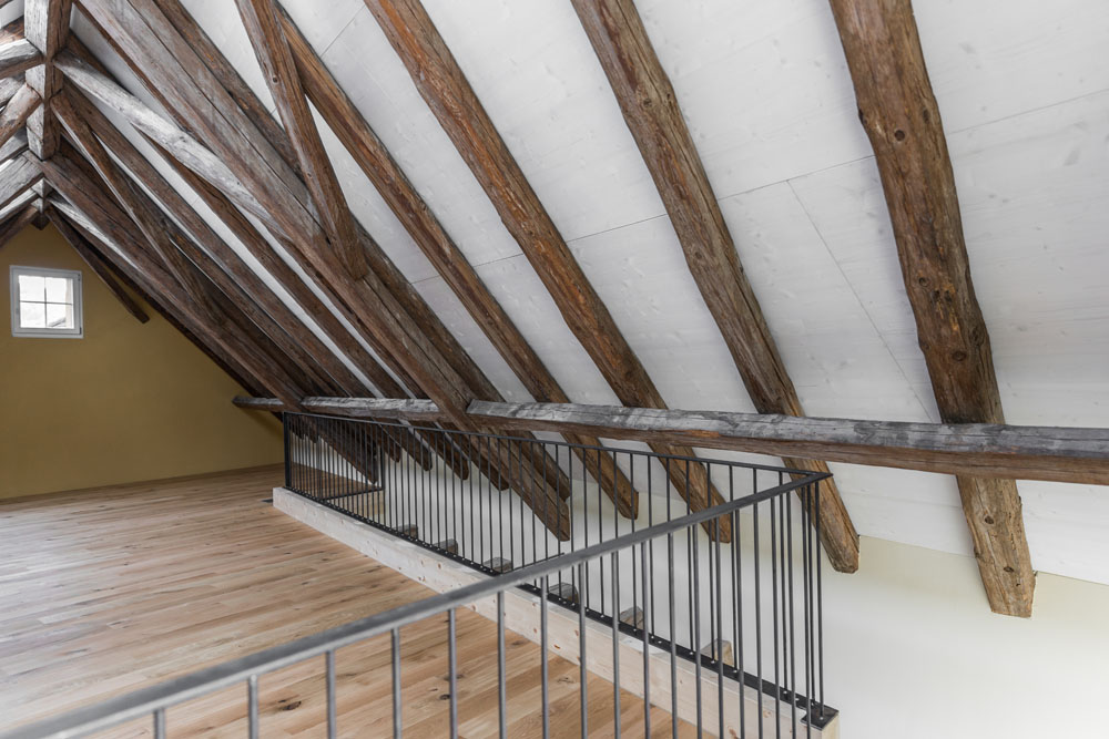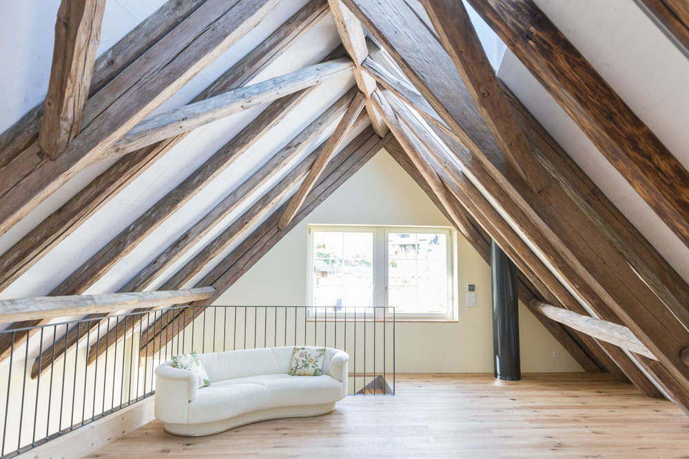 Der unscheinbare, stark sanierungsbedürftige Baukörper sollte in ein Wohn-Loft für zwei Personen umgenutzt werden. Ziel war es, die historische Substanz möglichst zu erhalten und sichtbar zu machen – insbesondere der eindrucksvolle, durch die Grundrissgeometrie verzogene, liegende Dachstuhl.