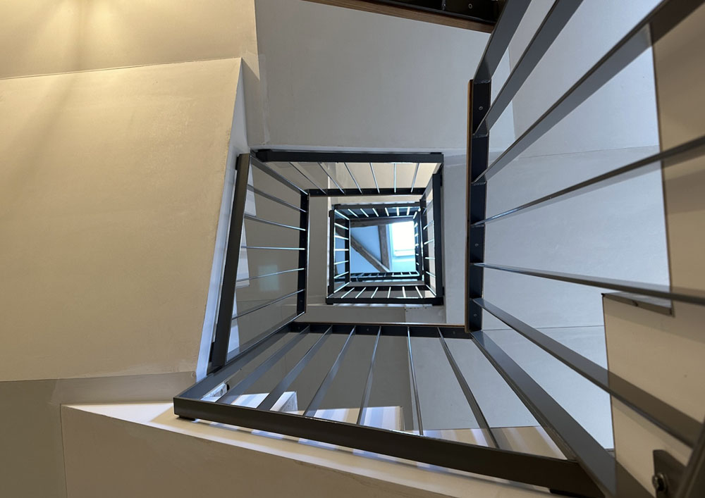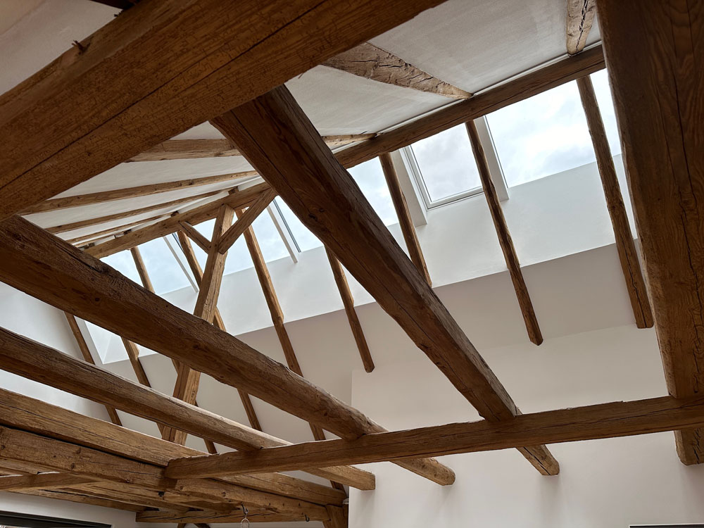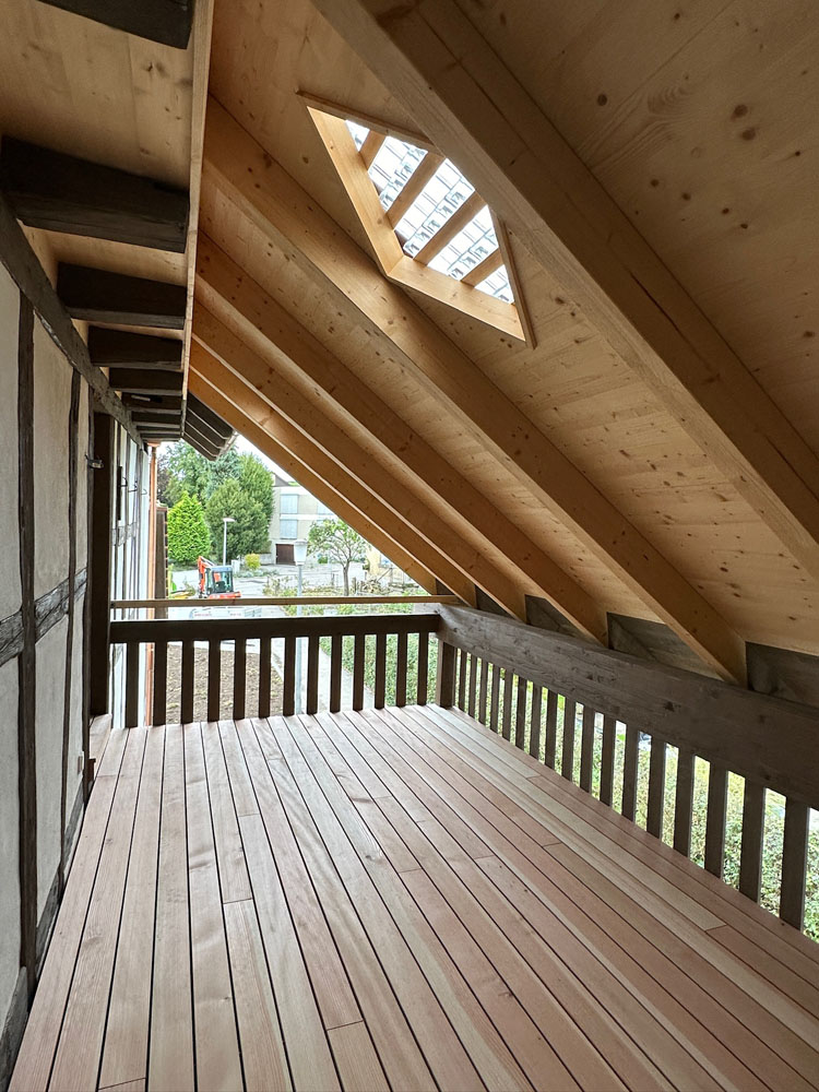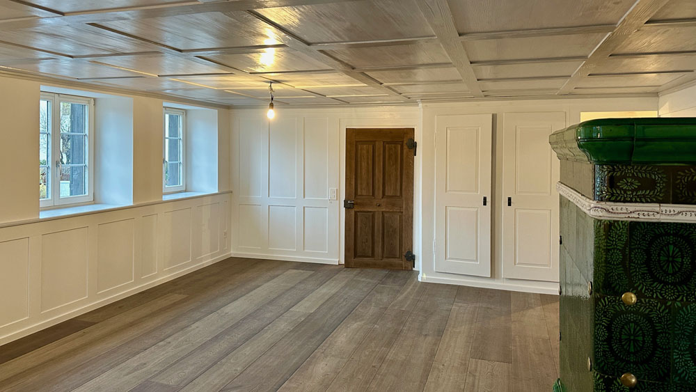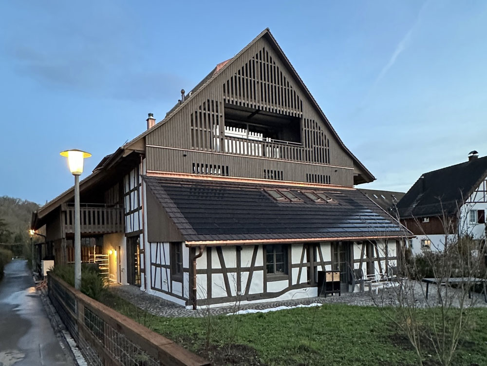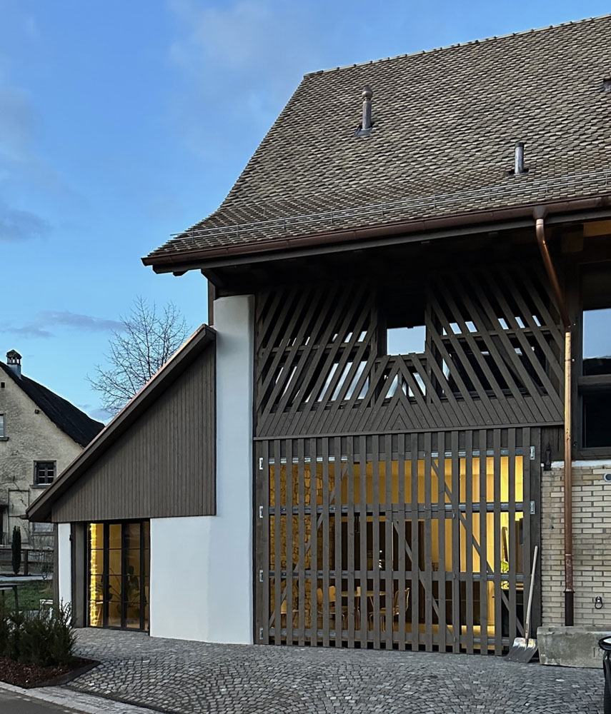 Die architektonische Haltung war geprägt von einem sensiblen Umgang mit der historischen Substanz. Die gezielte Materialwahl schafft eine Verbindung zwischen Alt und Neu und stärkt damit den Ursprung des Gebäudes. Eine sorgfältig gestaltete Photovoltaikanlage wurde auf dem Anbau (Wagenschopf) realisiert.